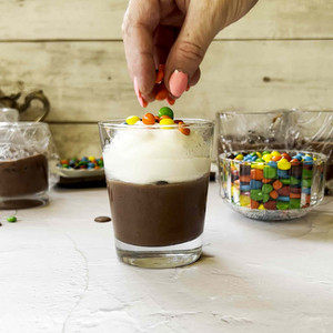 מוציאים את הכוסות מהמקרר ומזלפים (או יוצקים בעזרת כף) שכבה של קצפת מעל המעדן שבכל כוס.